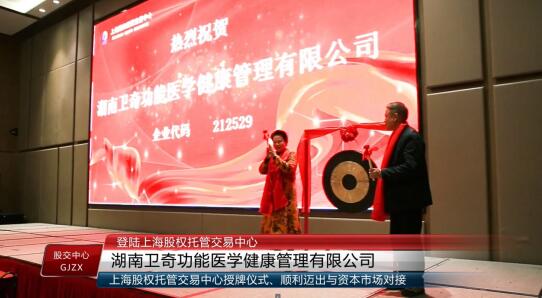 2023年12月28日,随着一阵挂牌锣声响起,经上海朗荣投资管理有限公司推荐, 成功推荐湖南卫奇功能医学健康管理有限公司,企业代码:212529 登陆上海股权交易中心展示板,顺利迈出与资本市场对接的第一步。企业领导人前来参加挂牌仪式。